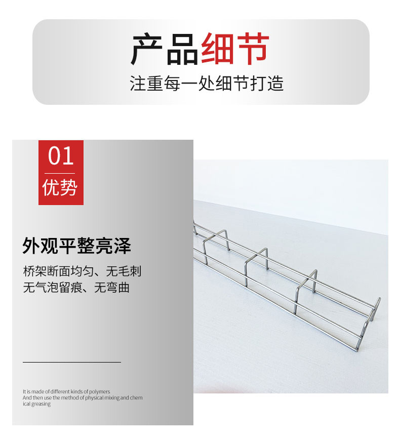华昱网格式桥架虽然轻便,但并不牺牲最重要的承载性能。桥架采用直径4mm-6mm的高品质钢丝根据力学原理进行优化配置混合,并采用特殊订制的焊接机进行横纵交叉焊接及其侧弦和顶弦的T型焊接,以达到每个焊点能承受500公斤的张力。T型焊接所形成的安全T型边沿是网格式桥架的全球专利,避免了焊接点的尖锐端面,不仅能保护线缆,对施工及安装人员也更安全。