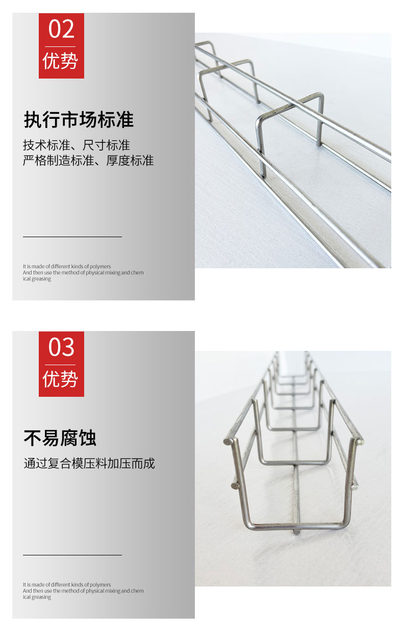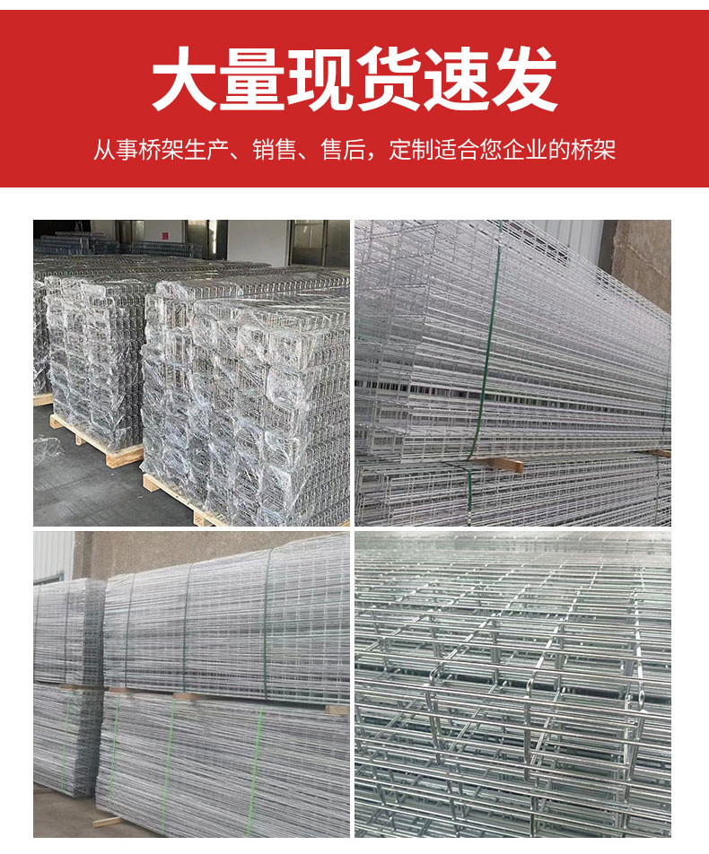 华昱网格式桥架有多种表面处理可供选择。其中电镀锌的锌层厚度是12-18微米,热镀锌的锌层厚度是60-80微米,且镀层均匀,抗腐蚀性优秀。对于一些特殊的环境,网格式桥架还可以提供经钝化的304L和316L高品质不锈钢系列桥架和配件,确实保证产品的经久耐用性.