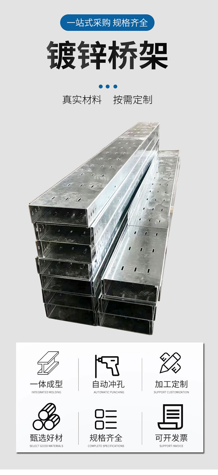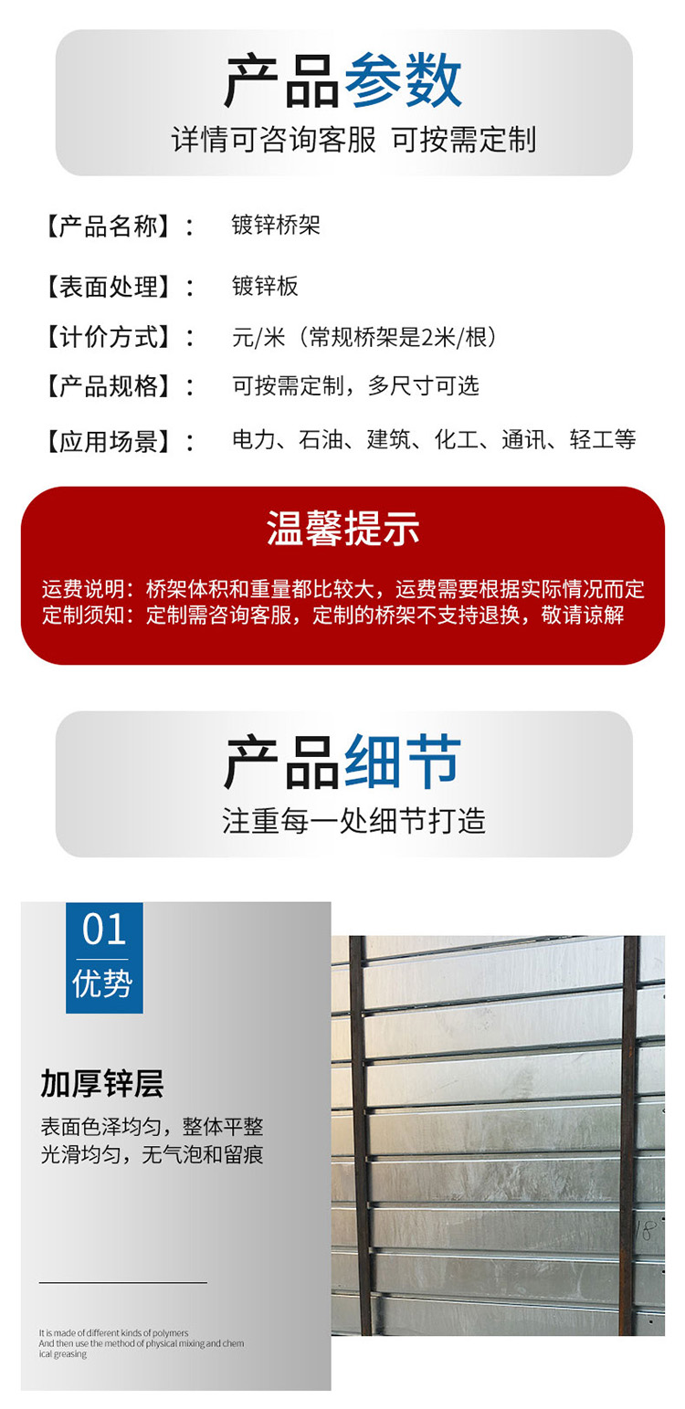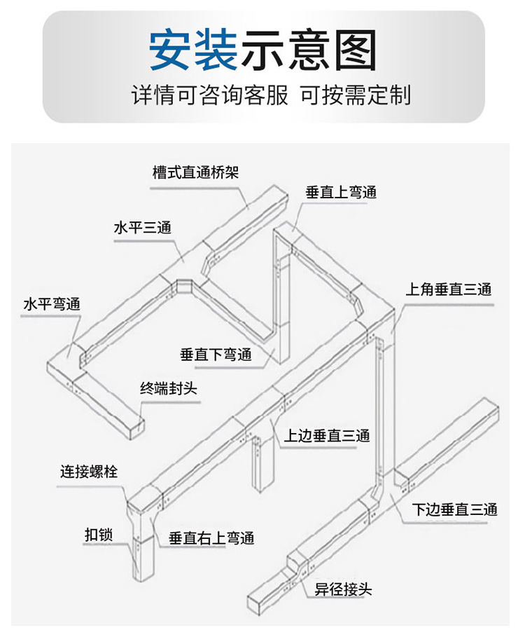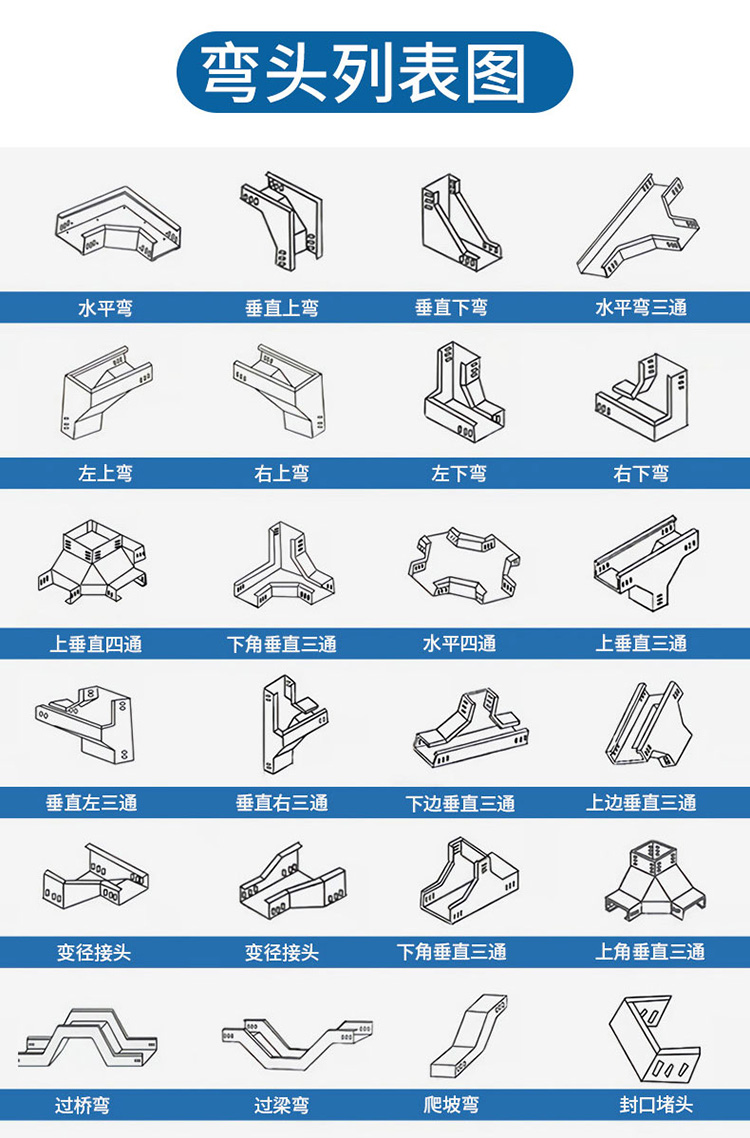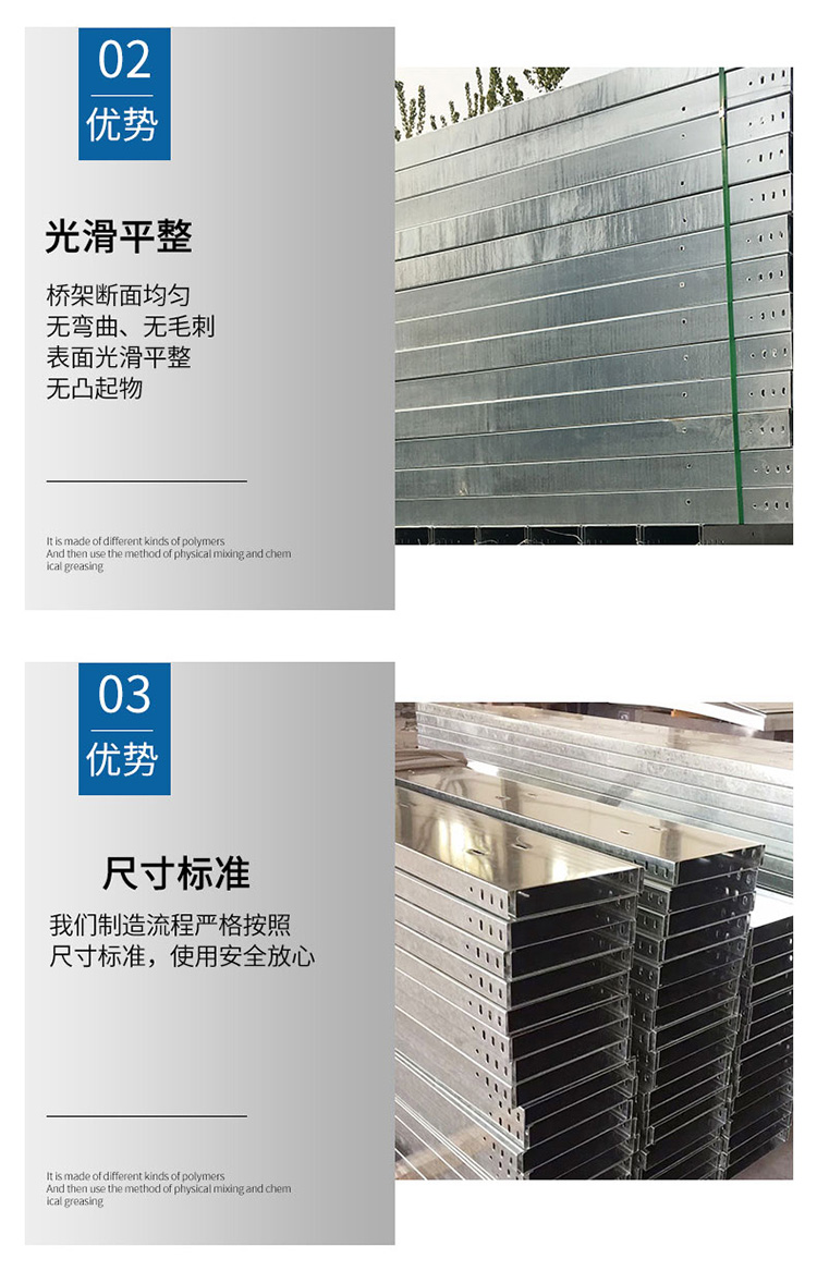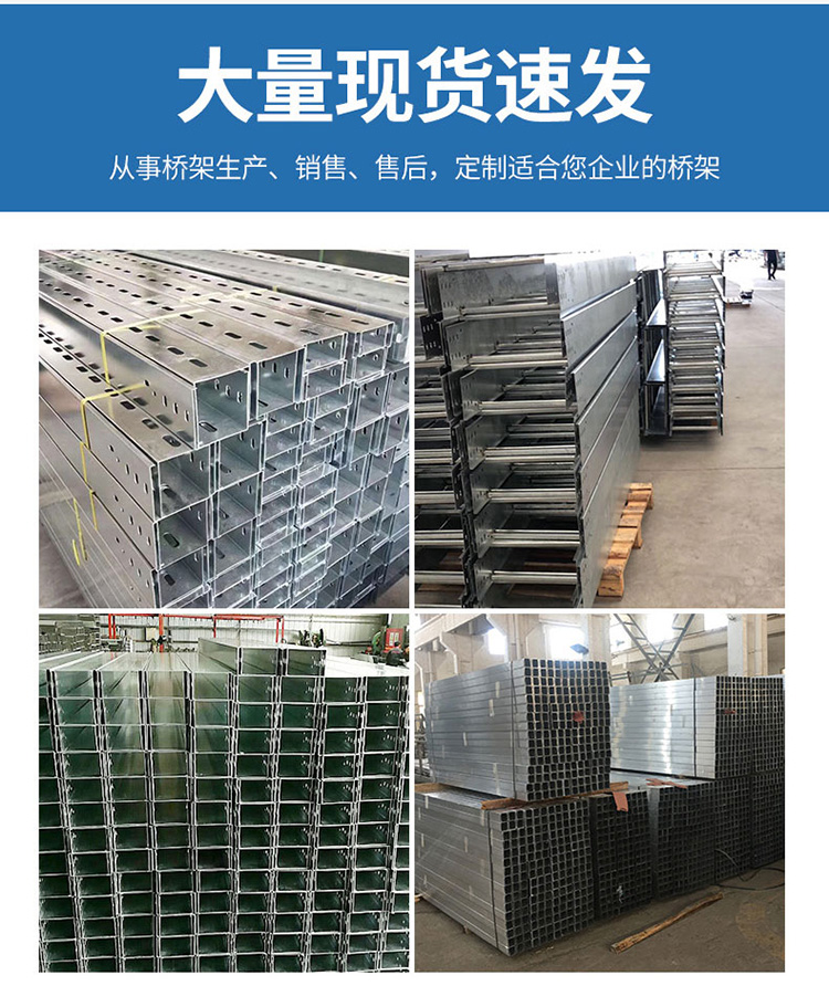托盘式电缆桥架是石油、化工、电力轻工、电视、电讯等方面广泛应用的理想敷设装置。它具有重量轻、载荷大、造型美观、结构简单、安装方便、散热透气好等优点,底部散热孔可用作安装孔,安装更可靠。弯通、三通、四通的结构为外形美观的圆弧形,内侧弯曲半径R200-900mm,电缆弯曲自然过渡,避免了电缆弯曲时产生的断裂,并能增加电缆桥架的强度。